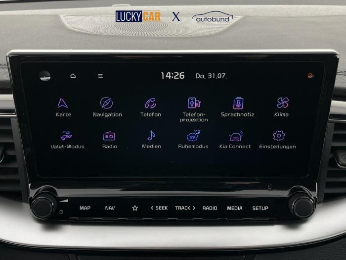 Android Auto, Apple CarPlay, Bluetooth, DAB (Digital Audio Broadcasting), Navigationssystem mit 10,25'' Touchscreen, USB-Anschluss, Full-LED-Scheinwerfer, LED-Nebelscheinwerfer, LED-Rückleuchten, Lichtsensor, Abgedunkelte Scheiben ab der B-Säule, Fensterheber elektrisch vorne und hinten, Innenspiegel mit automatischer Abblendfunktion, Lederlenkrad, Lenkradheizung, Mittelarmlehne, Multifunktionslenkrad, Klimaautomatik, Zwei-Zonen-Klimaautomatik, LED-Paket, Paket Gold+, 17'' Leichtmetallfelgen, ABS (Antiblockiersystem), Alarmanlage, Beifahrerairbag deaktivierbar, ESP (Elektronisches Stabilitätsprogramm), Isofix (Kindersitzbefestigung), Vorder-, Seiten- und weitere Airbags, Vordere Airbags, Fahrersitz höhenverstellbar, Geteilte und umklappbare Rücksitzlehnen im Verhältnis 40:20:40, Höhenverstellbarer Beifahrersitz, Sitzbezüge in einer Kombination aus Stoff und Kunstleder, Sitzheizung, KIA Garantie 7 Jahre / 150.000 Km, Berganfahrhilfe, Einparkhilfe hinten, Einparkhilfe mit Kamera, Fernlichtassistent, Intelligenter Geschwindigkeitsassistent / Verkehrszeichenerkennung, Müdigkeitserkennung, Notbremsassistent mit Erkennung von Fahrzeugen, Fußgängern und Radfahrern, Regensensor, Reifendruckkontrollsystem, Schlüsselloser Zugang und Start per Knopfdruck (Smart Key), Spurhalteassistent, Tempomat mit Geschwindigkeitsbegrenzer, Anhängerkupplung Vorbereitung, Außenspiegel elektrisch anklappbar, Außenspiegel elektrisch beheizbar, Außenspiegel elektrisch einstellbar, Dachreling, Zier-Chromleisten an den Seitenfenstern, EU-Fahrzeug mit Tageszulassung
