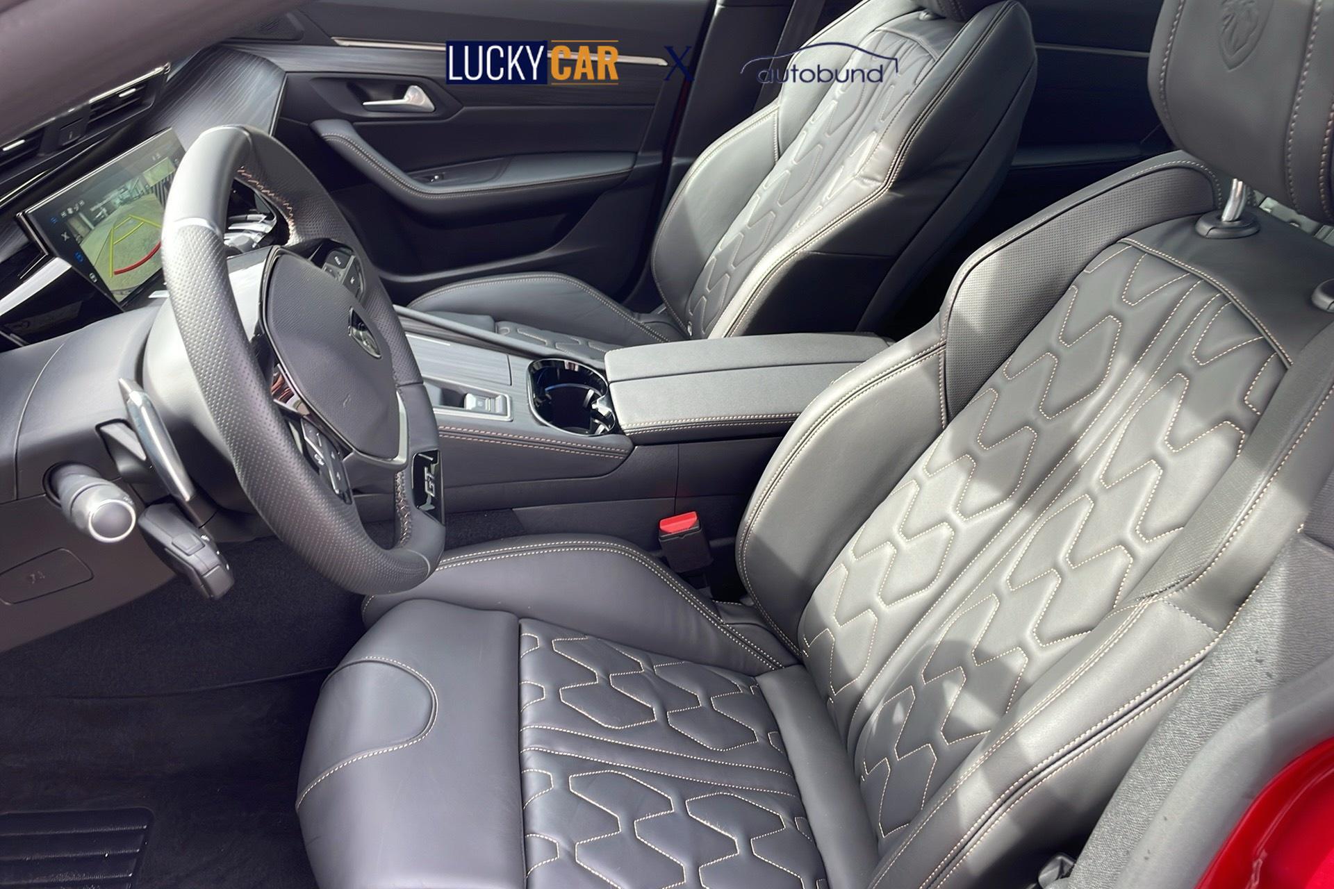 • Lenkrad aus perforiertem Narbenleder mit Chromringen und GT-Badge